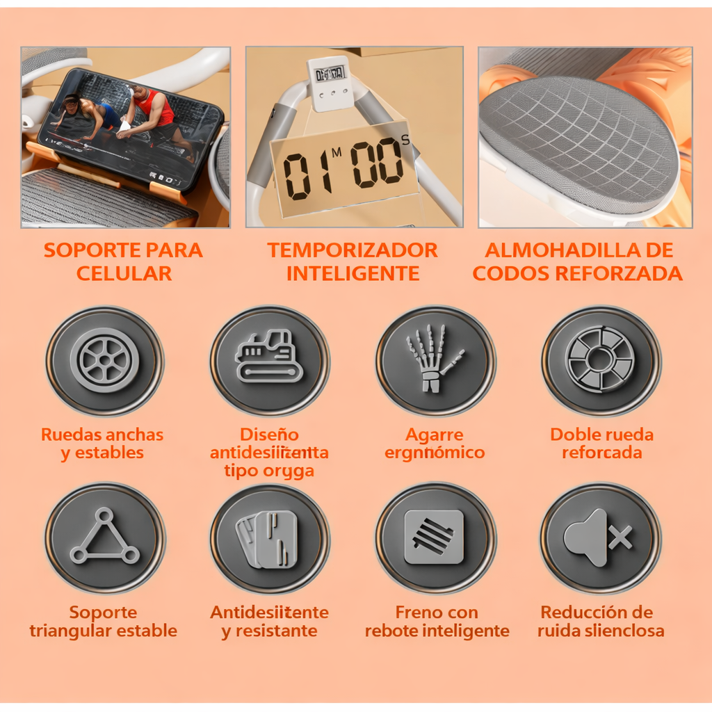 Su diseño moderno con doble rueda extra ancha, soporte para celular y contador digital te permite fortalecer el abdomen, brazos, hombros y espalda baja mientras sigues rutinas en tu teléfono.